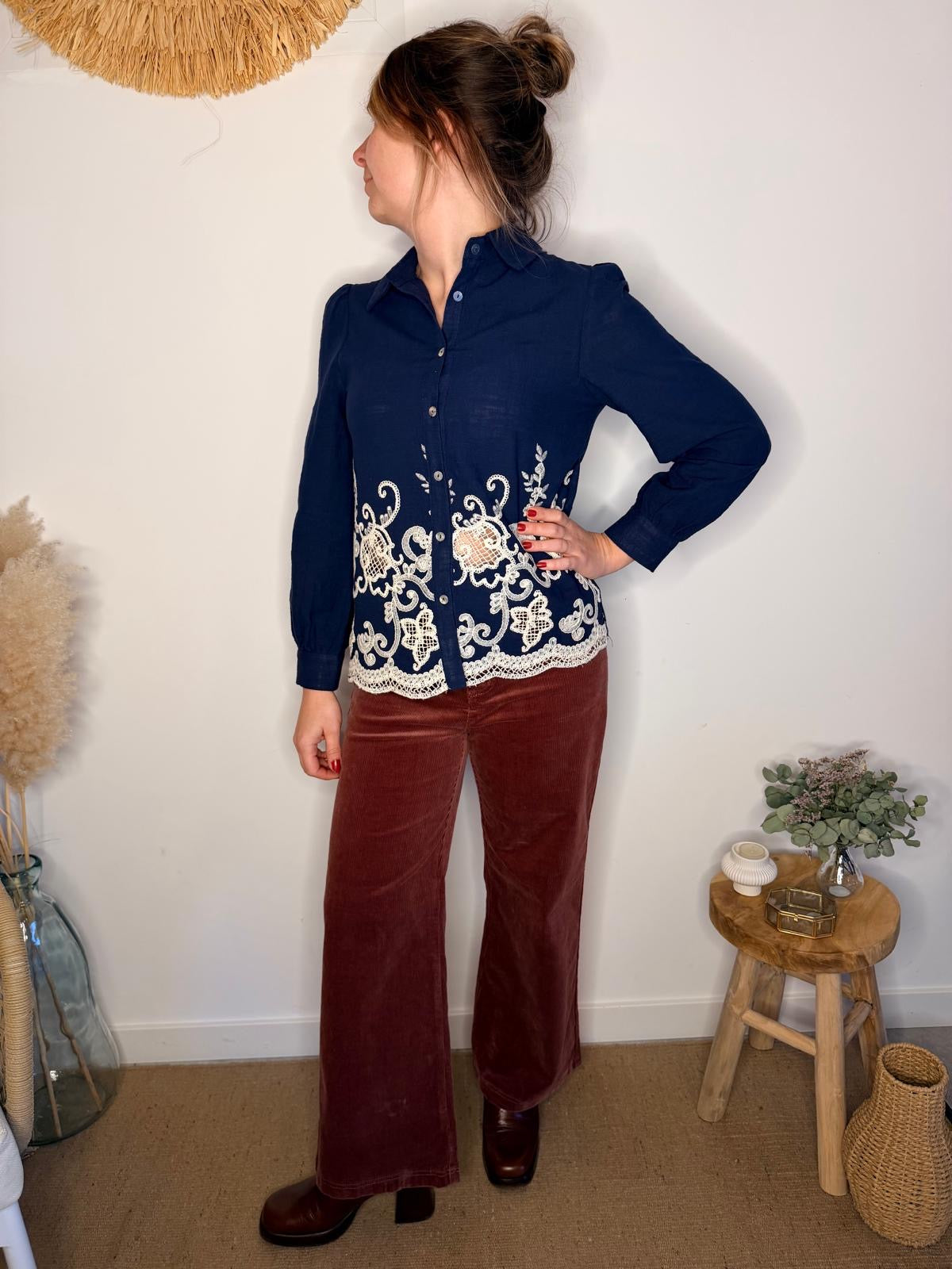 Élégante et féminine, cette chemise bleu marine se distingue par ses détails en dentelle ajourée sur le bas du vêtement. Une pièce raffinée qui allie le charme du classique à une touche bohème.
