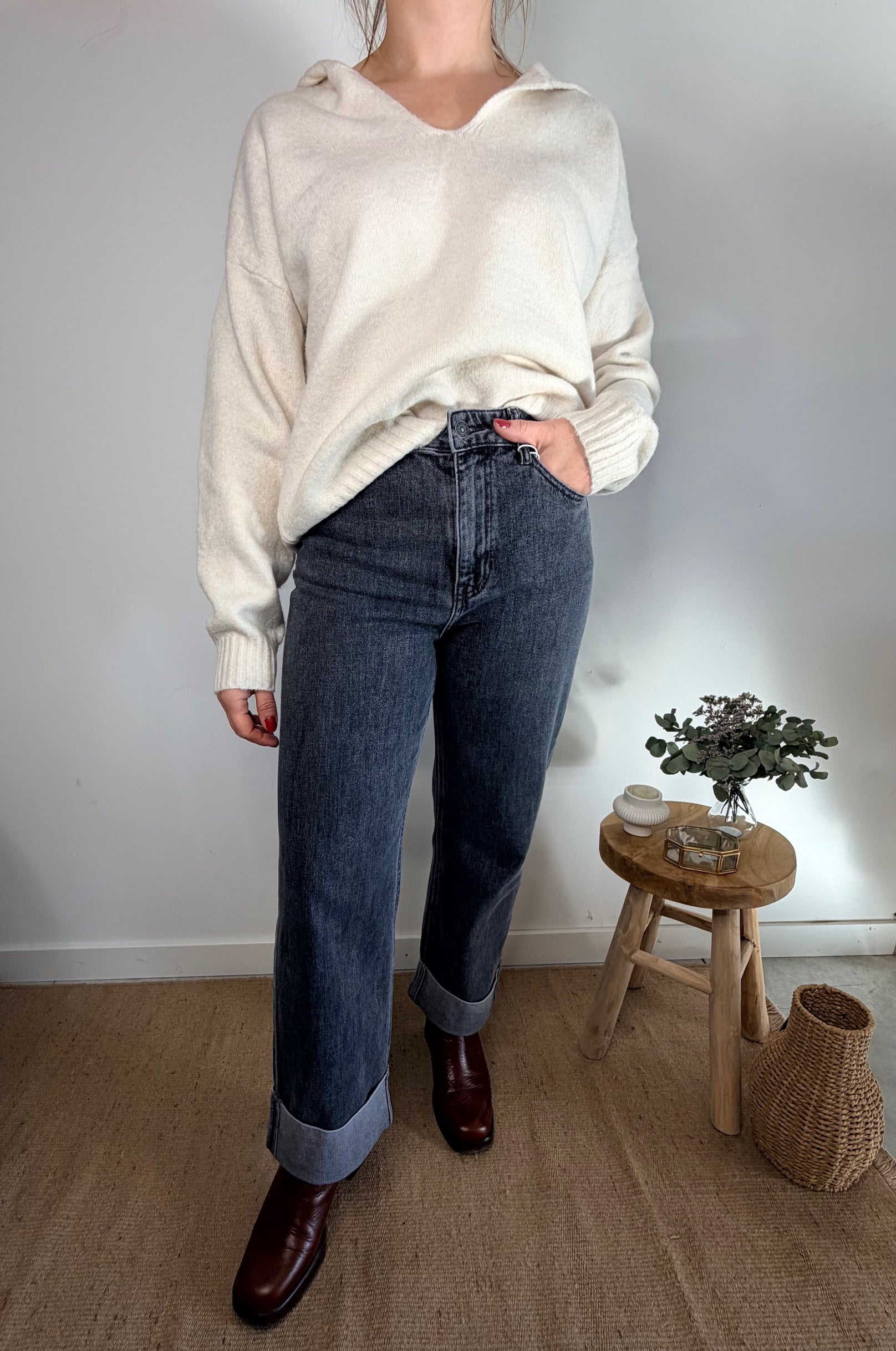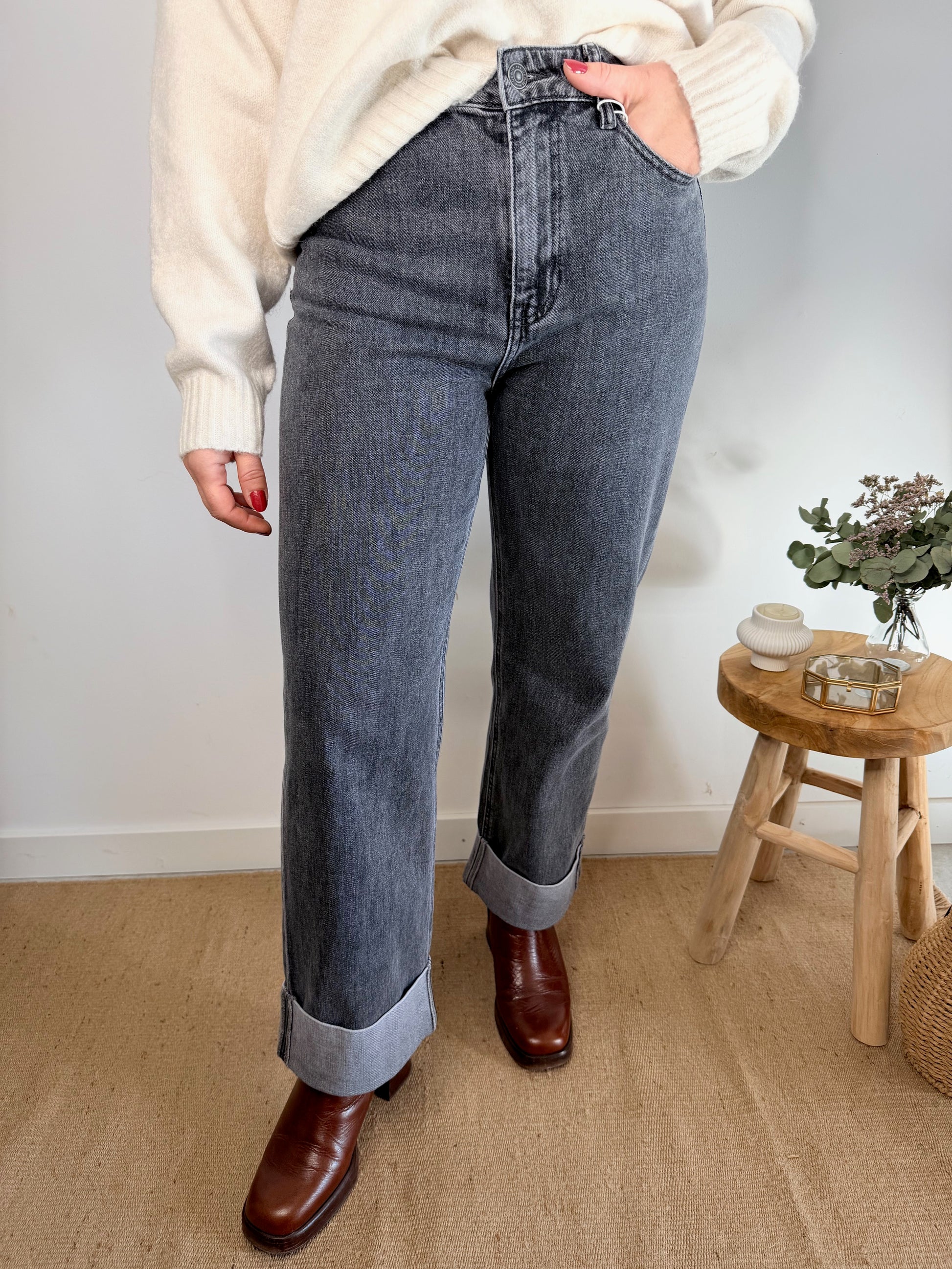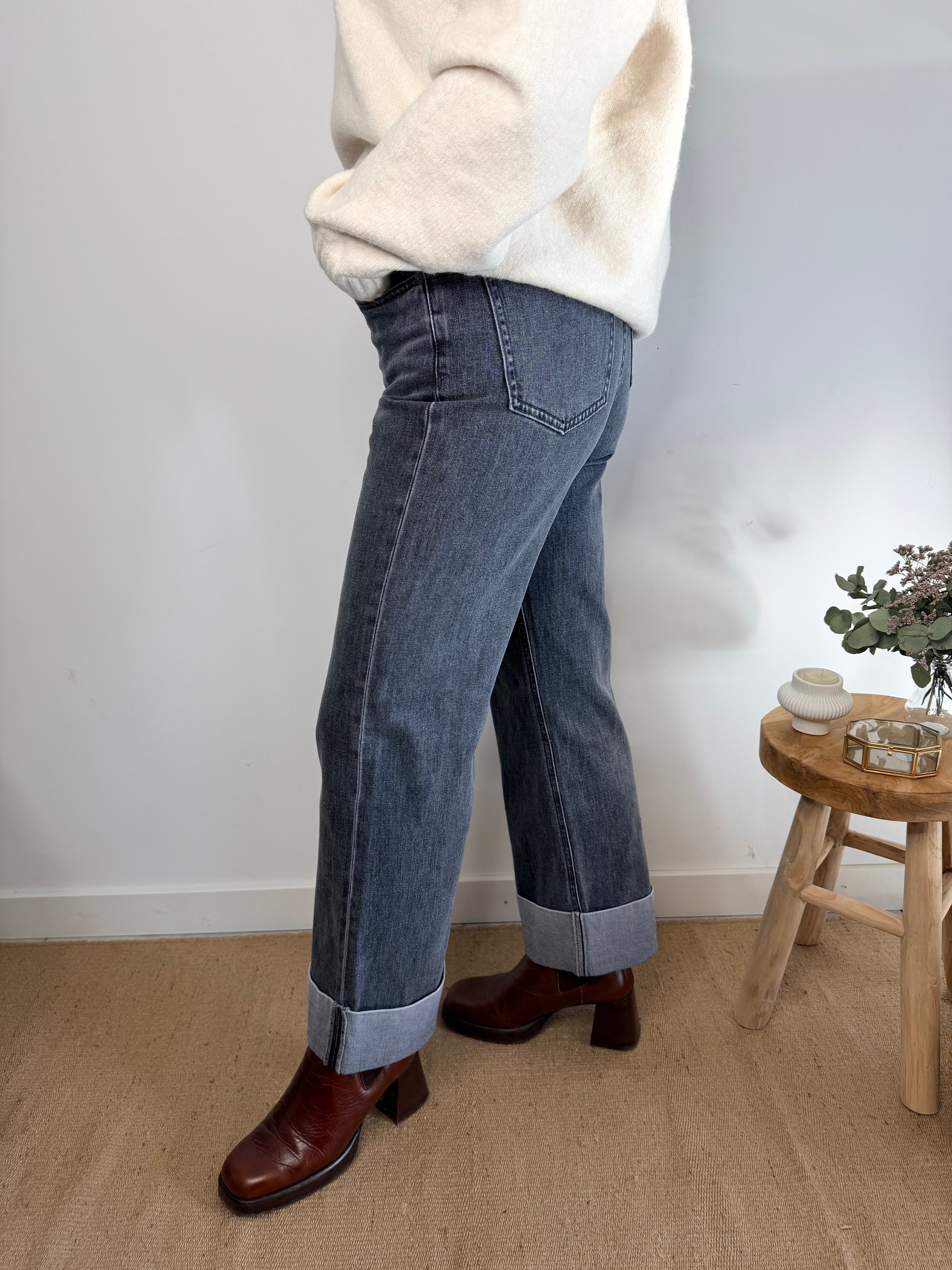 Ce jean à la coupe droite et taille haute allonge la silhouette tout en offrant un confort optimal. Son délavage gris et son large revers en bas de jambe lui donnent une touche moderne et originale, parfaite pour varier des classiques bleus.