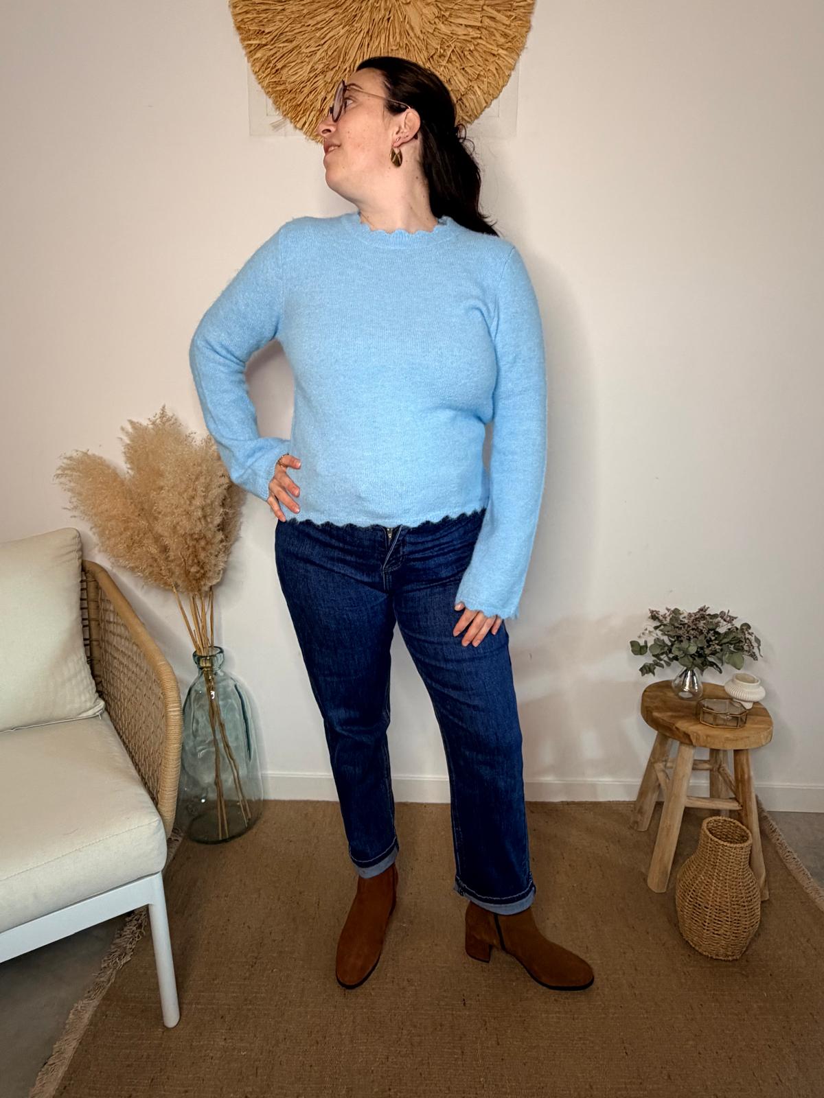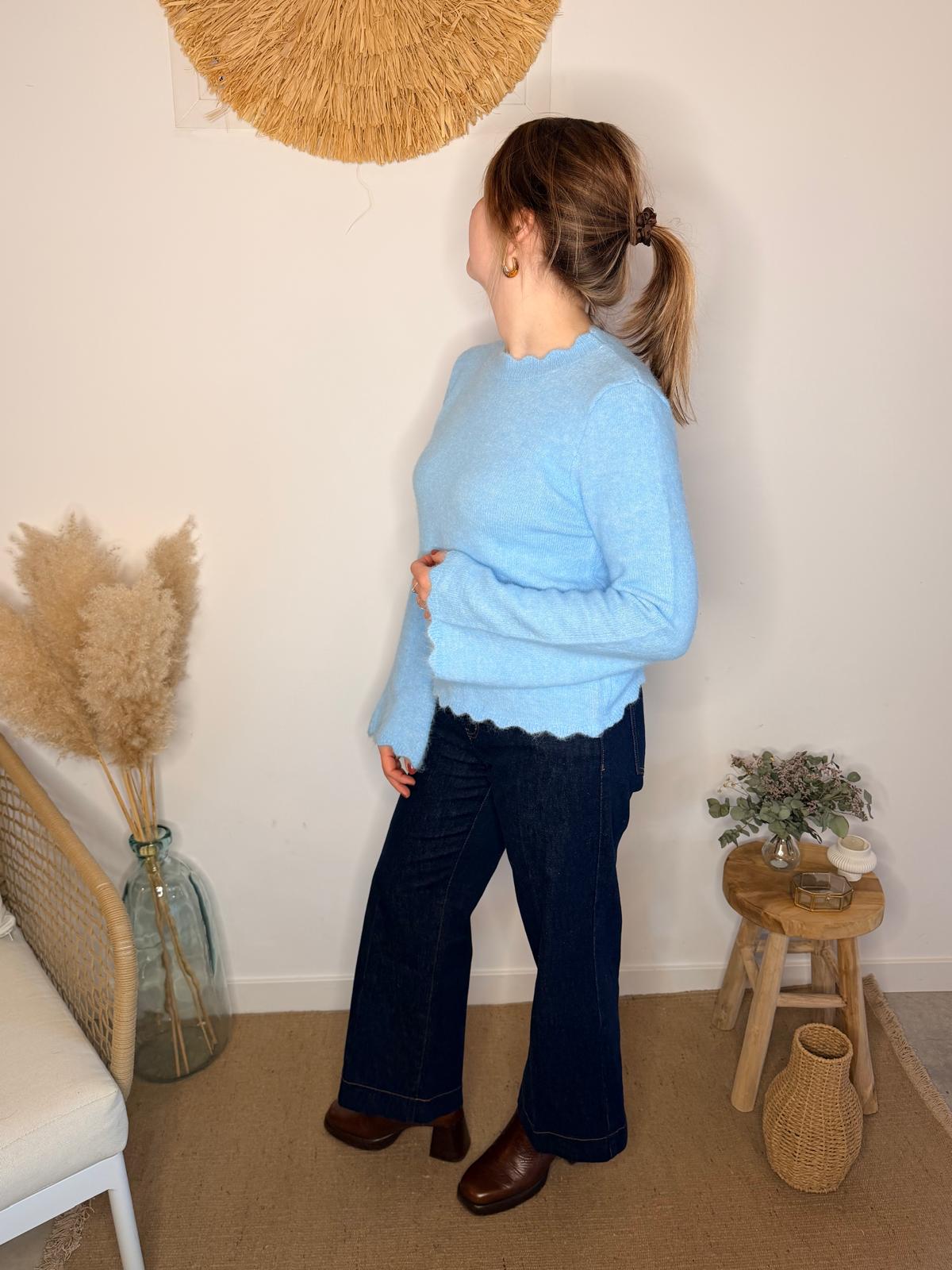 Ce pull bleu ciel séduit par sa maille douce et légère et ses finitions ondulées au col, aux poignets et à la base, qui lui apportent une touche féminine et délicate. Sa coupe simple et élégante en fait une pièce facile à porter au quotidien, tout en restant pleine de charme.